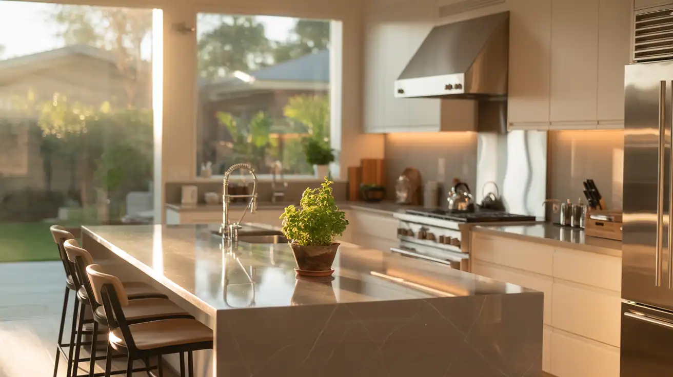 Make sure your island is at least 42 inches from cabinets for easy movement. Add bar seating for a natural meeting spot. Modern kitchens often have waterfall countertops for a sleek look.