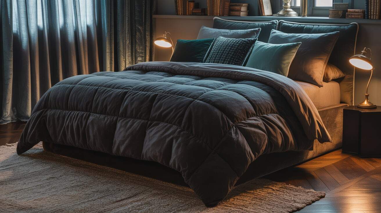 Choosing the right bedding can transform your sleep experience. Opt for materials like cotton or linen that feel soft against your skin. Darker colors, like the deep gray seen here, can create a calming atmosphere, perfect for a restful night.