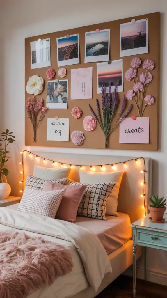 The soft glow of string lights around the mood board enhances the cozy vibe, perfect for late-night inspiration or relaxing with friends. This kind of display is not just decorative; it’s a reflection of personal style and interests. It encourages self-expression while making the room feel uniquely hers.