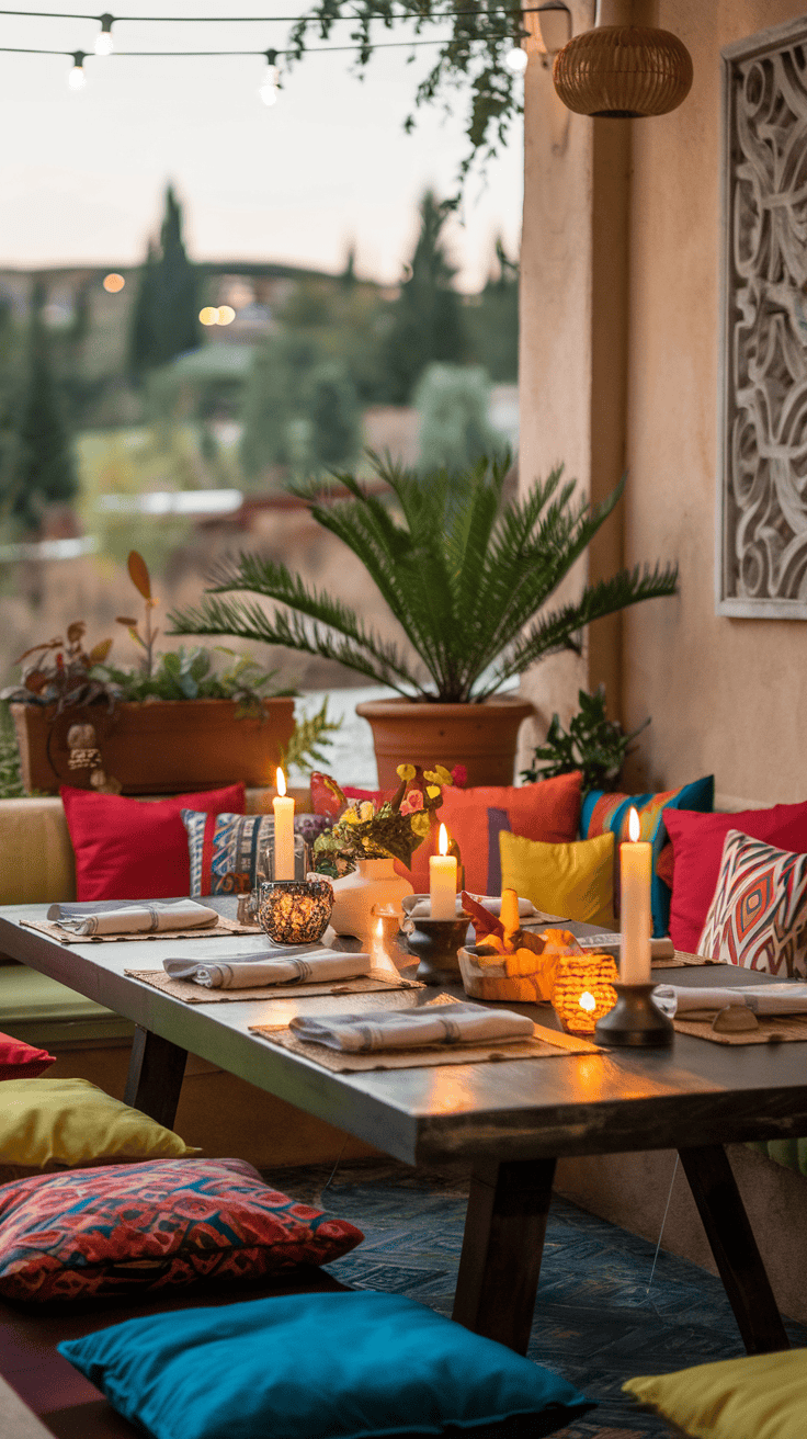 The vibrant colors of the cushions and intricate patterns on the seating invite guests to relax and enjoy their meal. This space is ideal for gatherings with family and friends, allowing for shared moments that feel special.