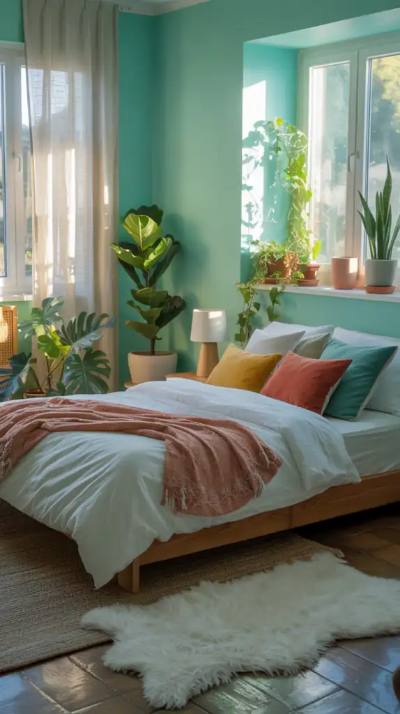 Step into a world of color with this stunning turquoise bedroom. The walls are painted a bright turquoise, creating a lively backdrop that instantly uplifts the mood. Sunlight streams in, casting playful shadows that dance across the room.