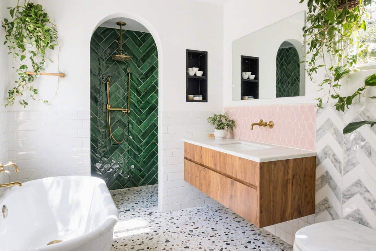 11. Retro Glam With Pink Fan Tile and Terrazzo