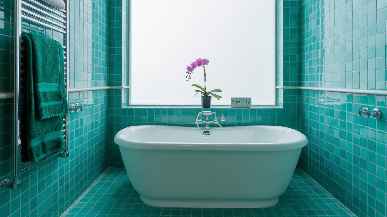 This bathroom is a vibrant showcase of color and design. The turquoise tiles wrap around the lower half of the walls, creating a refreshing and lively atmosphere. The contrast with the white tiles above adds brightness and keeps the space feeling open.