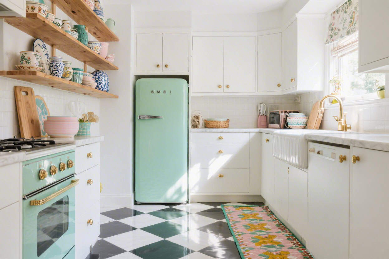 This one whispers “1950s soda fountain,” but keeps it chic. Think a mint-green SMEG-style fridge, powder-pink bar stools, and crisp white shaker cabinets to ground the space.