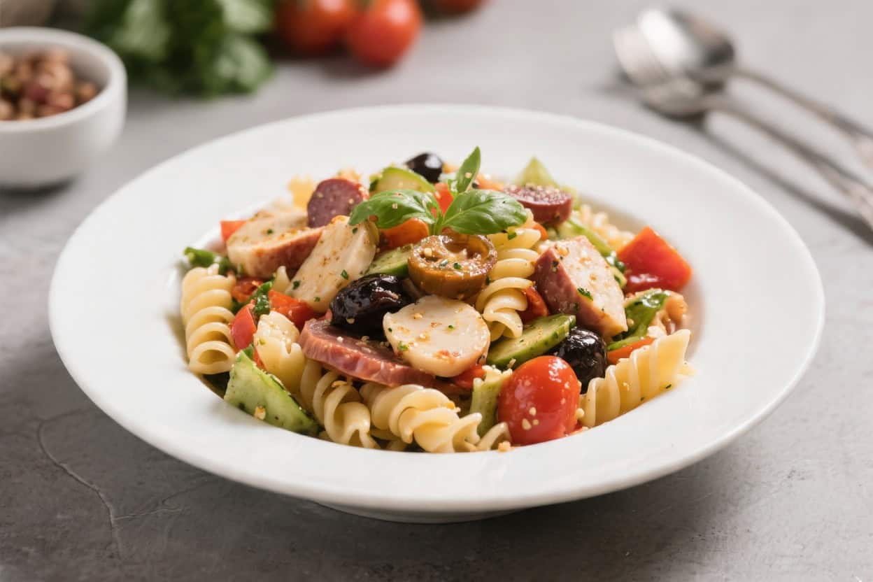 Final presentation: Beautifully plated Italian Antipasto Pasta Salad in a wide, low white ceramic bo
