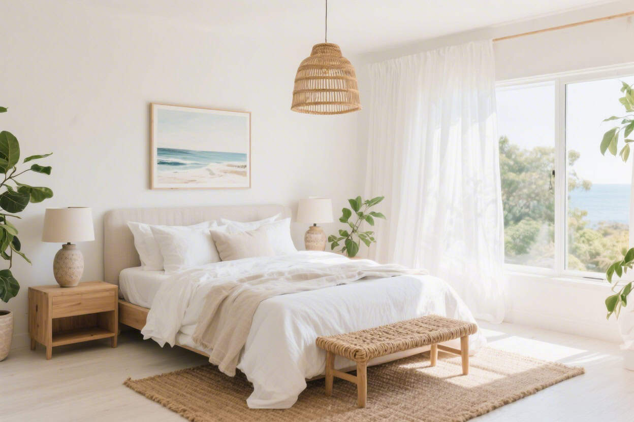 Layer in a sky-blue throw at the foot and swap heavy curtains for sheer white drapes that invite the light. A jute rug, ceramic table lamps with sandy textures, and a big framed print of quiet waves complete the calm.